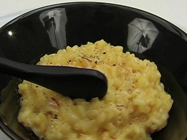 Вкусное ризотто можно приготовить за минимальное количество времени.Состав:рис — 150 гр;говяжий бульон — 600 гр;пармезан — 100 гр;лук — 1/2 штуки;соль, перец, шафран, масло, говяжий жир — по вкусу.