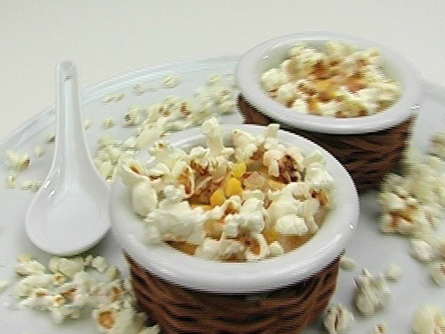Простая и вкусная кукурузная похлебка разнообразит ваше меню.Состав:кукуруза — 130 гр;сливки — 400 гр;лук — 1/2 штуки;бекон — 50 гр;немного попкорн;белый перец, соль с травами, оливковое масло — по вкусу.