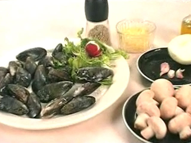 Рецепт мидий с шампиньонами.Состав:мидии — 20 штук;лук — 1/2 штуки;чеснок — 3 зубчика;шампиньоны — 8 грибов;сыр, белое вино, масло, перец, соль, базилик, орегано.