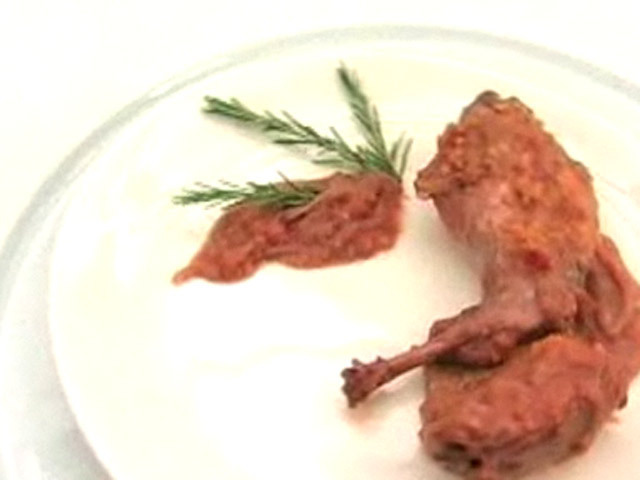 Испанская кухня. Рецепт кролика с красным вином.На 2 порции:мясо кролика — 5 кусков;помидора — 2 штуки;лук — 1 штук;чеснок — 1 зубчик;хлеб — 2 кусочка;мука, миндаль, розмарин, соль, оливковое масло, черный перец, красное вино.