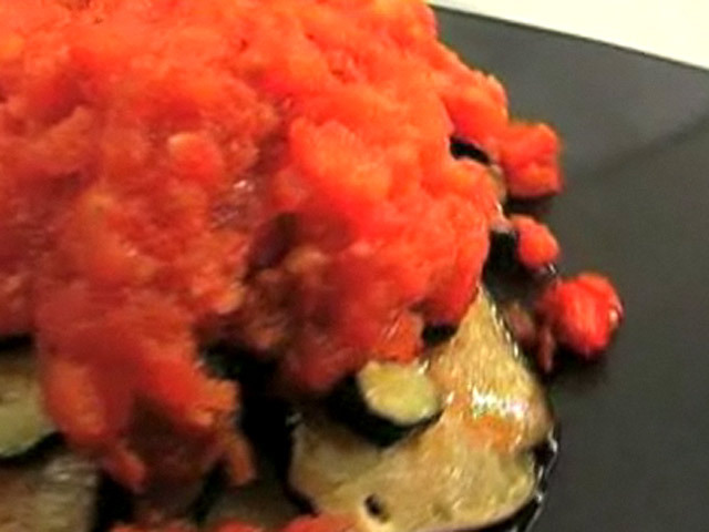 Рецепт испанской кухни. Картофель с овощным соусом.На 2 порции:помидоры — 4 штуки;картофель — 2 штуки;кабачок — 1 штука;баклажан — 1 штука;перец — 1 штука;чеснок — 1 зубчик;тросниковый сахар — 1 чайная ложка;соль, черный перец, оливковое масло.