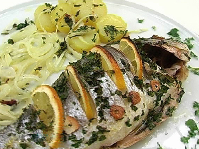 Простое, но очень вкусное блюдо.Состав:дорада — 1 штука;розмарин — 1 веточка;картофель — 200 гр;чеснок — 1 зубчик;петрушка — 1 пучок;лук — 1/2 штуки;лимон — 5 долек;немного оливкового масла.