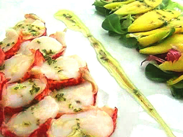 Необыкновенно вкусная закуска из омара с добавлением манго.Состав:омар — 1 штука;лук зеленый — 1 пучок;манго — 1 штука;уксус хереса, оливковое масло, белый перец, морская соль, тросниковый сахар, ассорти салатов.