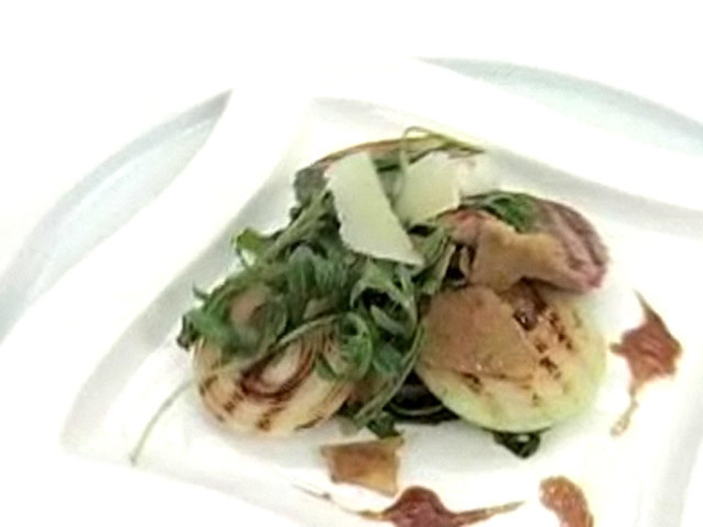 Низкокалорийный рецепт телятины с пармезаном и руколой. 240 калорий.Состав: телятина — 120 гр;лук — 1 штука;руккола — 1 пучок;сыр — 30 гр;черный перец, оливковое масло, бальзамический уксус, соль.