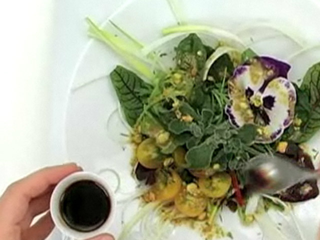 Рецепт низкокалорийного салата с фисташками. 180 калорий.Состав:лук, свекольные листья, масло, фисташки, бальзамический уксус, цветок, укроп.