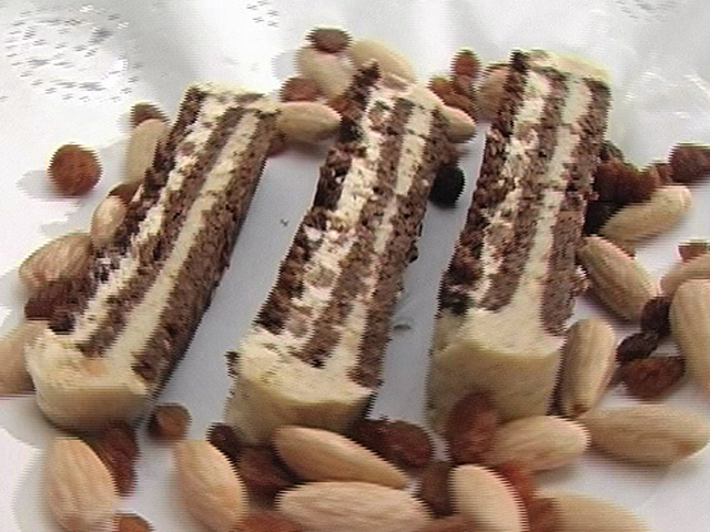 Сырная закуска для пикника.Состав:ржаной хлеб — 6 кусочков;камамбер — 200 гр;изюм — 100 гр;горгонзола — 200 гр;соленое масло — 100 гр;миндаль — 100 гр.
