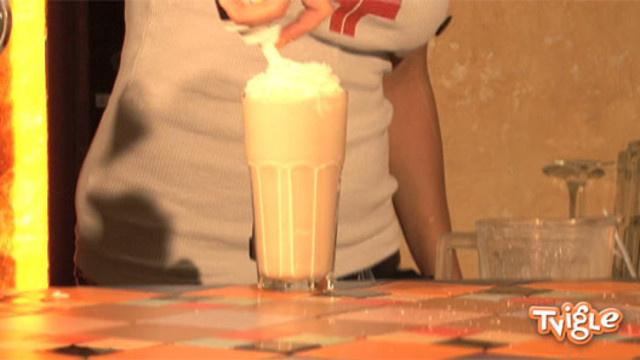 Его очень часто заказывают молодые мамы для своих маленьких детей!Состав:банан — 1/2;мороженное — 3 шарика;молоко — 100 мл;шоколадный сироп — 30 гр;тертый миндаль — 2 ложки.